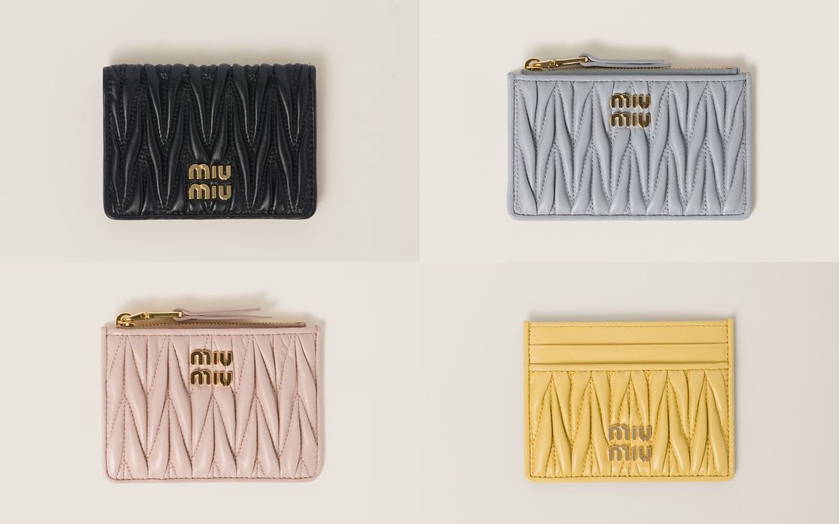 這幾近以來風靡全球的MIU MIU,從小皮件卡夾入手絕對沒問題!精緻的matelassé工藝為納帕皮革卡套與錢包增添時尚特色,圖案立體而富質感,營造出極致典雅的立體層次,與亮麗迷人的金屬標誌相互輝映,令品牌格調奪目而出。