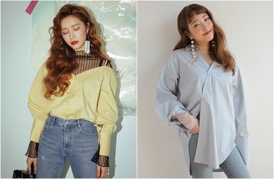 過去我們穿襯衫時,並不會在裡面搭上特別明顯的內搭衣,直到去年冬天稍微流行在裡頭搭上合身的微高領衣,延續到今年春季,特別流行將透視的網紗上衣搭配在襯衫裡頭,讓胸口、袖子處露出網紗設計,立刻讓簡單的襯衫增添100%的時髦度,韓妞味立馬飄~散~