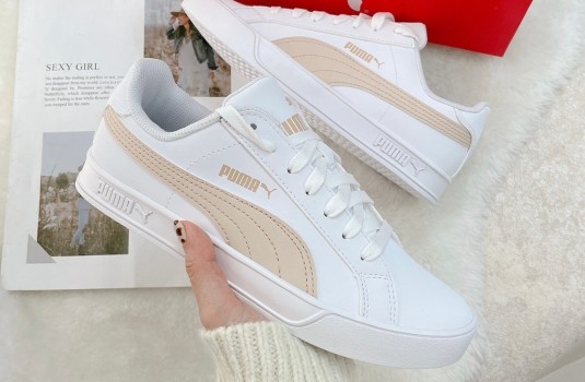 這雙是PUMA與ABC-MART合作的Smash Vulc系列鞋款,目前只在ABC-MART販售,以日常穿搭為主題,簡約時尚的外觀讓妳能輕鬆運用於穿搭中,首波共推出奶油色與基本黑白色,以質感皮革為主角點綴流線LOGO,怎麼搭配都不會出錯!