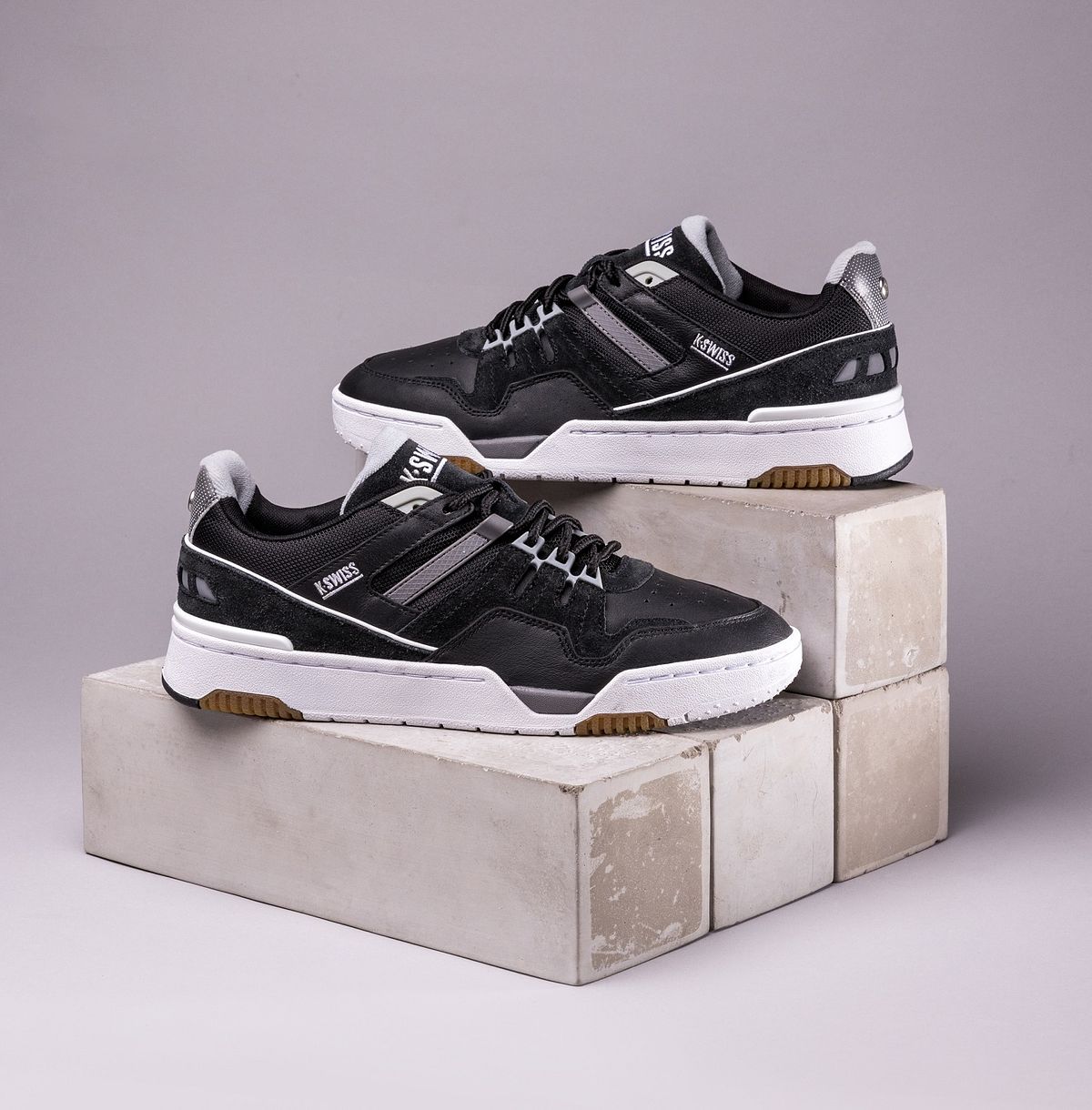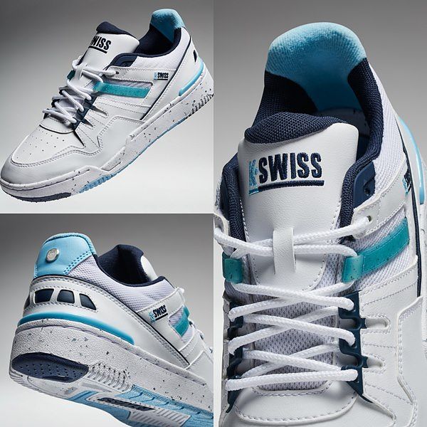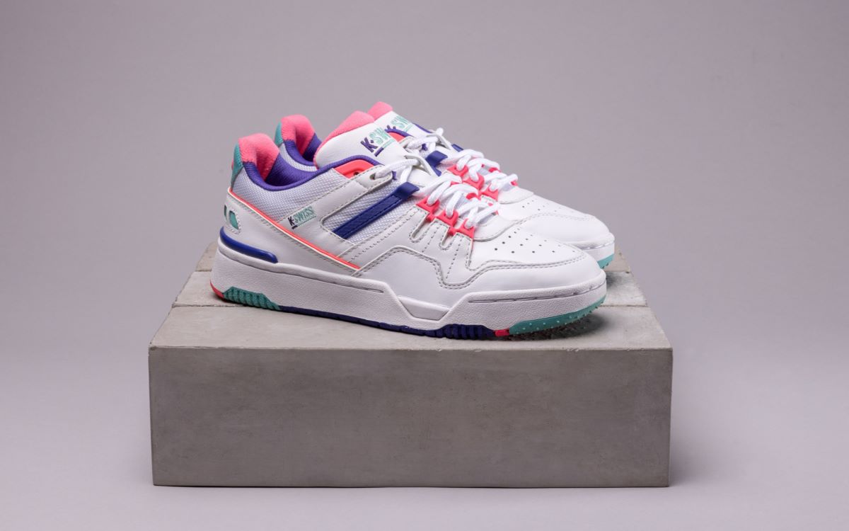 【MATCH RIVAL復古球鞋】的設計繆思來自80年代網球鞋風潮,擷取經典鞋款Gstaad Si-18系列精髓為結構基礎,結合嶄新的設計元素混搭,跳脫傳統5條線盾牌輪廓的刻板印象,改以鋸齒狀的鞋面裁片為底,透過視覺強烈對比色的腰線及鞋眼扣來全新勾勒K-SWISS與5線的深厚淵源。