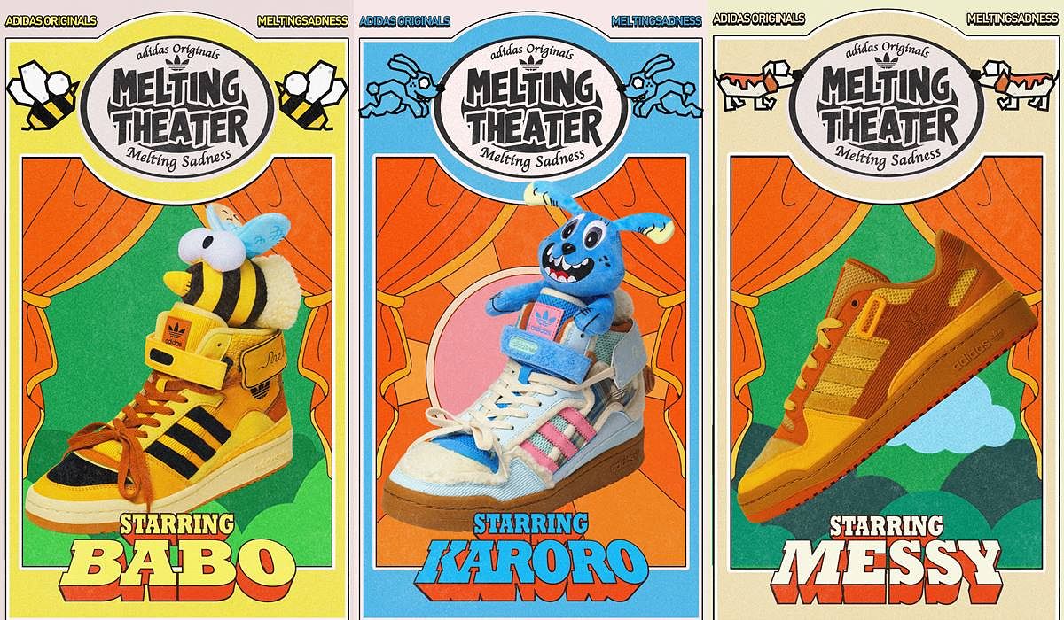 無獨有偶,潮流聯名系列Melting Sadness再獻玩心之作本次也搶先於全台開售。在人氣鞋款FORUM的鞋型基礎上,將Melting Sadness標誌性卡通角色KARORO、BABO以及MESSY的形象和特點結合在鞋身之上。將角色的細節例如兔子尾巴、鞋墊等作木紋化處理,搭配異材質結合,抽像表現出如提線木偶絨毛玩偶般的繽紛角色,帶你一起闖入別樣的“童趣世界。招牌KARORO兔子玩偶造型鞋,粉藍色外觀碰撞突破天馬行空的幻想。小蜜蜂BABO活潑的造型巧妙轉化於翅膀與觸角的魔鬼氈設計中,搭配蜜蜂玩偶造型鞋飾,更添收藏感。被木偶積木幾何化的MESSY小狗造型裝飾環抱鞋身,成為超具辨識度的視覺符號。