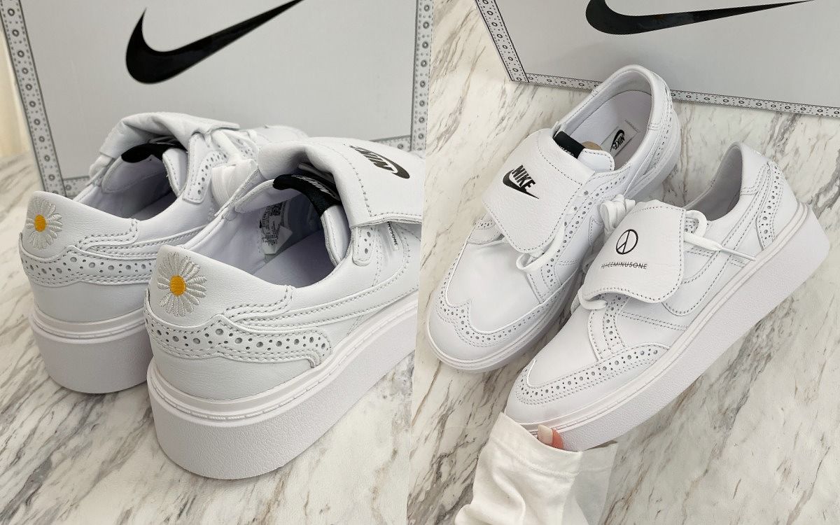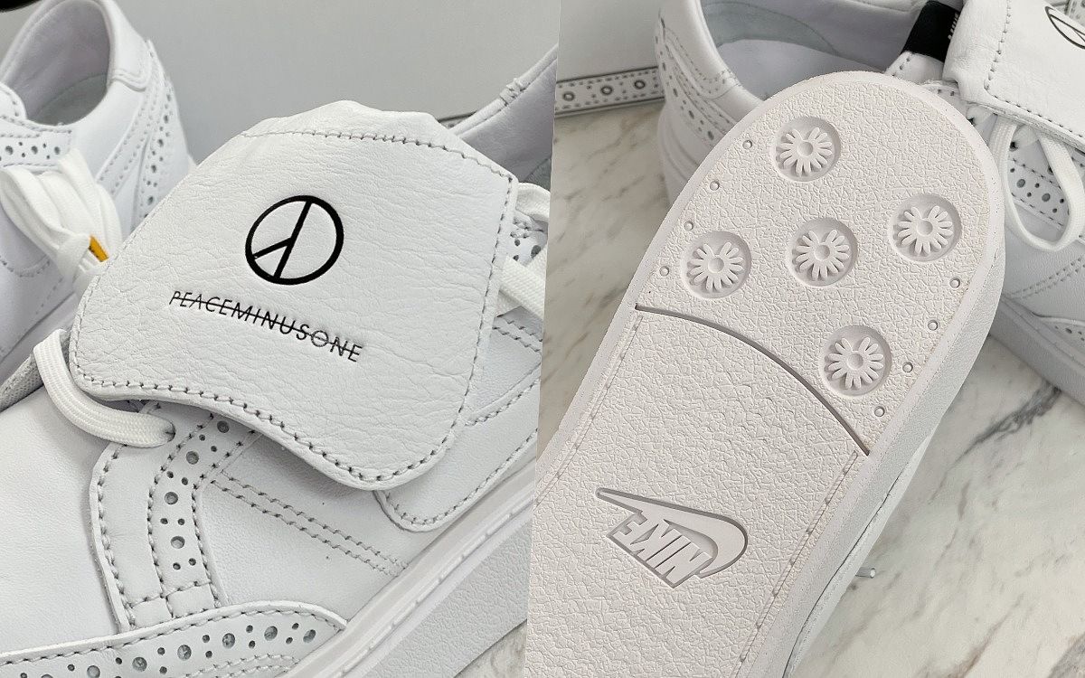期待了這麼久,現在就來帶大家搶先開箱實鞋,首先最令人驚喜的是,球鞋本身是以優質皮革鞋面打造,並融入牛津鞋的雕花細節,外型靈感來自於Nike Tiempo足球鞋和經典高爾夫球鞋,點綴著具有現代風格的鞋翼、可拆卸的鞋舌和鞋帶,帶來正裝和運動間的平衡美感!鞋後跟上繡有雛菊圖案,鞋墊和鞋帶兩端上的PEACEMINUSONE標識細節,代表了雙方聯手的代表性標誌!