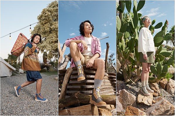 日本地區限定配色靈感取自日本戶外音樂祭充滿個性的多彩色系,融合大自然地景色彩搭配撞色編織鞋帶設計完美呈現日系機能潮流的獨有風格,滿足日系穿搭要求與眾不同的風格需求。蔚藍海岸配色以日系單寧工作褲搭配同配色圖騰襯衫,混紡羊毛襪展現輕鬆戶外感;沙漠綠洲配色以經典大地色系搭配卡其短褲與裸粉跳色機能外套,穿出不無聊的大地系風格。迷霧草原帶著輕柔春日草地感,柔粉與灰綠交織,儘管搭配機能衝鋒衣,依舊仙氣爆棚。香草花園以棉花糖般的輕盈粉系配色襯托出柔軟可愛氣質,天空藍搭配帶裸膚調的粉色展現天真浪漫的氣息,為戶外探險點綴美好想像,值得一提的是台灣引進香草花園配色全尺碼商品,誰說只有女生才能粉粉好心情。此次日本地區限定配色特別推出以逢魔時分、夕陽餘暉為配色靈感的夜幕紫黑,低調悶騷卻不容被忽視,誰說黑鞋一定只能當配角;橘標防水RETRO HIKER系列的自然系多層次配色,無論是音樂祭還是戶外露營都能釋放探險家的有趣靈魂、盡情穿搭。