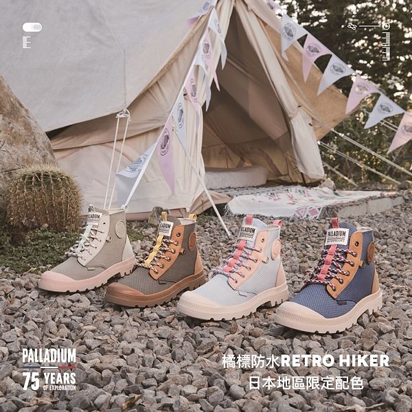 法國軍靴品牌PALLADIUM 創立75年來持續引領全球的探索者們以獨特的自我風格展開隨心所欲的冒險旅程,無論在城市間移動、秘境探索或背包旅行皆能輕鬆穿上PALLADIUM盡情展開。而橘標防水系列自2019年推出以來,兼具防水機能且不失流行的外型,不僅深受全球城市探索者喜愛,更在台灣、日本、香港等地尤其受到廣大粉絲與戶外玩家推崇。2022年PALLADIUM日本地區更推出專為戶外音樂祭設計、兼具機能潮流與風格穿搭的橘標防水RETRO HIKER系列-日本地區限定配色。除了PALLADIUM廣為人知的強大防水機能外,日本地區限定配色靈感取自日本戶外音樂祭充滿個性的多彩色系,融合大地自然地景色彩,推出迷霧草原、香草花園、蔚藍海岸、沙漠綠洲與夜幕紫黑等五款專屬配色,提供音樂祭迷與戶外探險家無論晴雨皆能盡展個性風格,全天候盡情奔放。