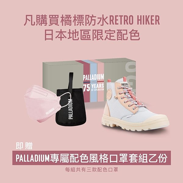 活動內容:凡購買橘標防水RETRO HIKER系列 - 日本地區限定配色新品即贈專屬配色PALLADIUM風格口罩套組乙份(內含三款款專屬配色PALLADIUM風格口罩與品牌口罩套乙個),同筆消費加購任一鞋款服飾配件再享85折優惠。