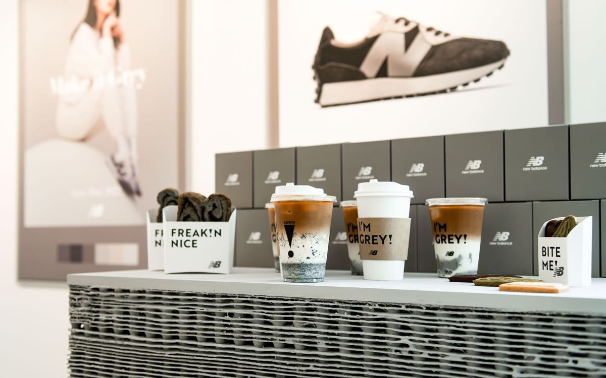 此次與CAFE!N跨界合作,不只在空間上響應,打造全新策展空間,CAFE!N 團隊更以 GREY & BALANCE 為主題研發聯乘餐飲,推出2款元祖灰冠軍拿鐵、經典吐司以及Q版造型餅乾。2款元祖灰冠軍拿鐵分別以新鮮芋泥融入竹炭粉以及新竹福源的黑芝麻醬,打造不同口味的「灰」與 GREY DAY 致敬;CAFE!N 經典吐司以竹炭豆漿入麵團,佐焙茶奶酥餡料旋紋,讓灰色多層嚼感體驗;而3片1盒的Q版餅乾包括 : 抹茶口味的574、巧克力口味的 New Balance logo和奶香原味的 CAFE!N logo。全系列聯明商品除了可愛好拍,不僅好吃亦對身體友善無負擔。