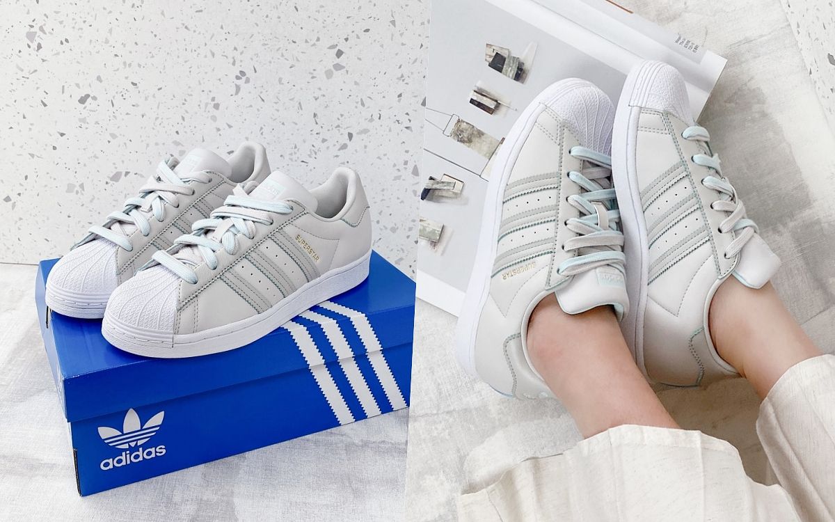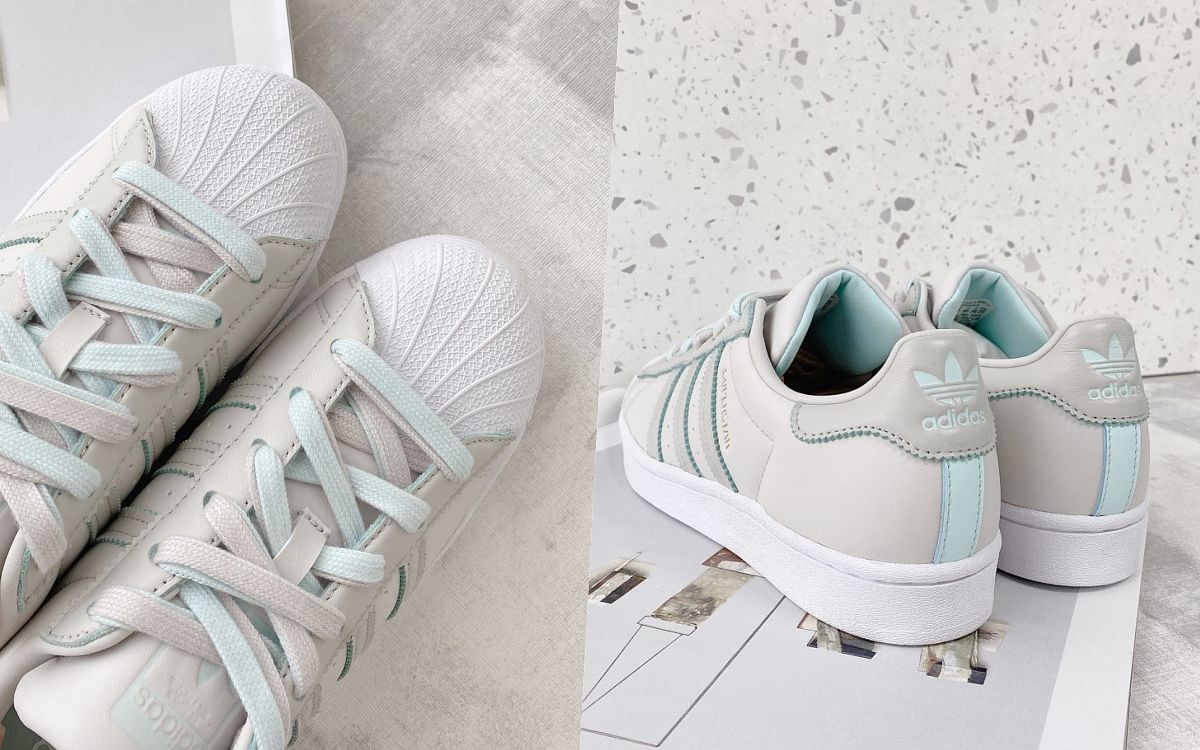 adidas Originals SUPERSTAR鞋款風靡全球,經過時尚潮流的更替也絲毫不減熱度,此款SUPERSTAR以灰色鞋面拼接白色橡膠貝殼型鞋頭,搭配灰色及淡藍綠色的雙色鞋帶,直接抓住所有目光,同時於鋸齒狀三條線邊緣點綴淡藍細節,自鞋身、鞋帶到經典橡膠貝殼鞋頭,每個細節都無與倫比的令人驚艷。