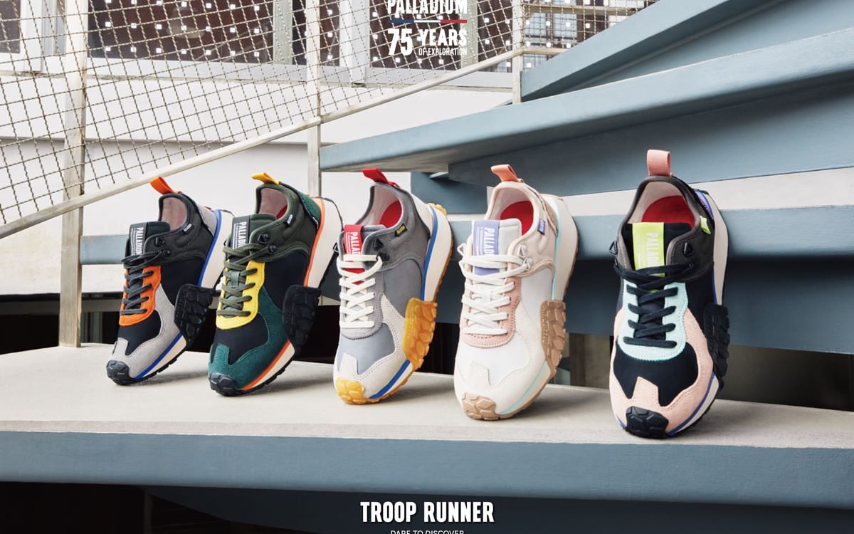 潮流圈復古風潮熱度延續,TROOP RUNNER軍種潮鞋融合了經典外型與潮流元素,以科技纖維、網眼尼龍、麂皮面料打造異材質拼接鞋面,高辨識度的鑽石菱紋打造全新輪胎橡膠顆粒鞋底並向上延伸至外側鞋身設計,而鞋底部分將品牌「PALLADIUM」字樣以玩味奇趣的樣貌呈現,2022秋冬配色同時獻上了5款潮流色彩,分別有帥氣潮流風格的城市灰、城市灰橘、叢林黃綠,同時提出甜酷女孩們最喜愛的粉紫潮流及柔霧粉,粉紫潮流配色在鞋面使用夢幻的寶寶藍、寶寶粉及帶有潮流感的紫色,而柔霧粉則以裸膚粉及奶茶色作為配色設計,兩款甜酷女孩的專屬配色,不論是個性的甜酷風格或是夢幻的甜美穿搭都能輕鬆駕馭,TROOP RUNNER軍種潮鞋5款秋冬潮流新色,不論是夏季搭配,或是秋冬穿著都非常適合。