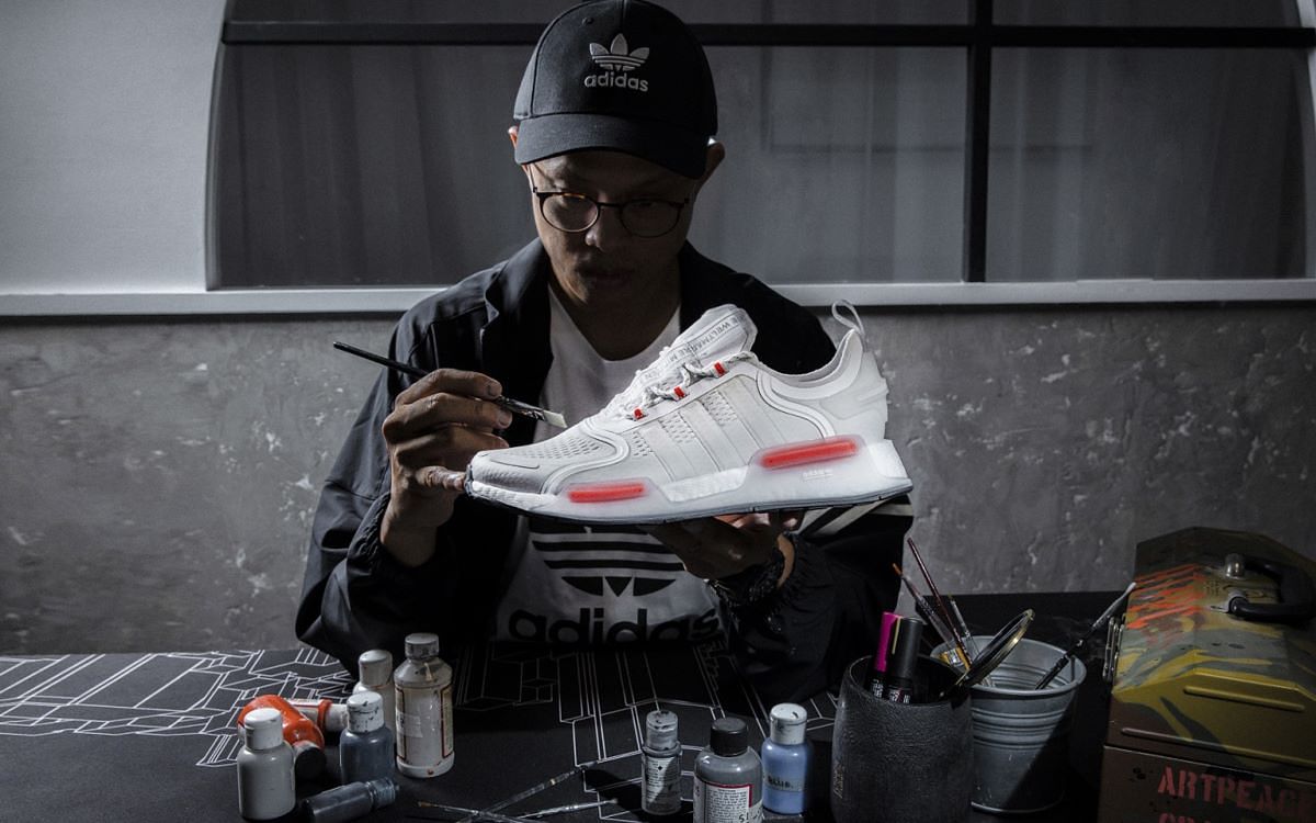 Artpeace Graphic成立於 2006 年,創辦人陳立儒憑藉對於街頭文化與藝術創作的熱愛,用擅長的手繪方式,結合街頭、塗鴉、迷彩等元素呈現作品,從創作涵蓋客製化商品、店家牆面設計,或是街頭塗鴉。此次與作為原創精神的代表adidas Originals合作,客製團隊以城市遊牧為題,詮釋兩雙代表性鞋款NMD_V3與NMD S1。NMD_V3以Urban Rhythm Camo為題,將都市中的流動感結合NMD_V3前衛橘,以鏤空設計打造出一座微景城市,透過金屬媒材與塗鴉表現城市遊牧民族突破未知的無限可能性。NMD S1的藝術創作則命名為TPC tiger Camo,以迷彩花紋結合金屬零件打造台北地圖美學。專注於創作本身,本次的合作以設計反應NMD遊牧精神與三葉草潮流文化的藝術創作,並於8/22(一)至9/11(一)限定期間於adidas信義品牌概念店展出。