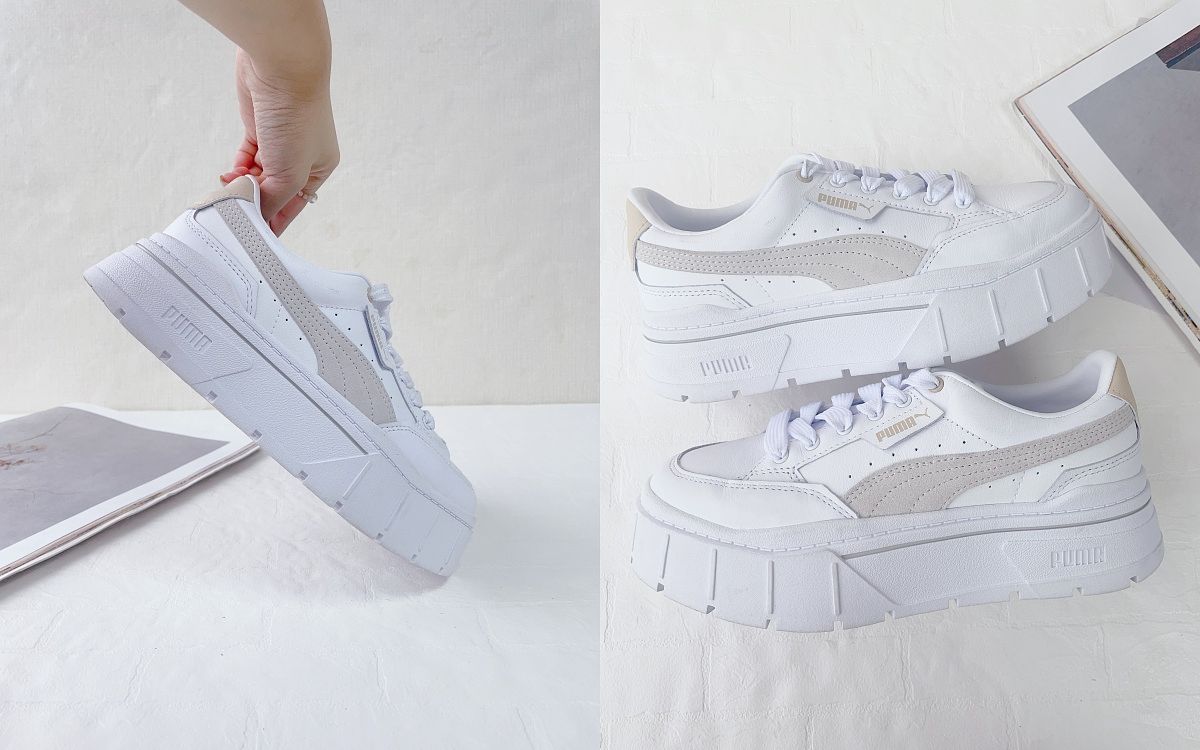 【 PUMA Mayze 鋸齒厚底妹子鞋】融合復古與現代的鞋款特色,使用德比鞋結構組成保有女孩的優雅氣息,以高級純白皮革包裹鞋面,其層層堆疊線條鮮明的鋸齒大底象徵氣勢扶搖直上的自信女力,更是瞬間抓住眾人目光的一大亮點,最後則於鞋側使用麂皮異材質畫上復古招牌彎刀,成功打造女孩完美比例的秘密武器 !