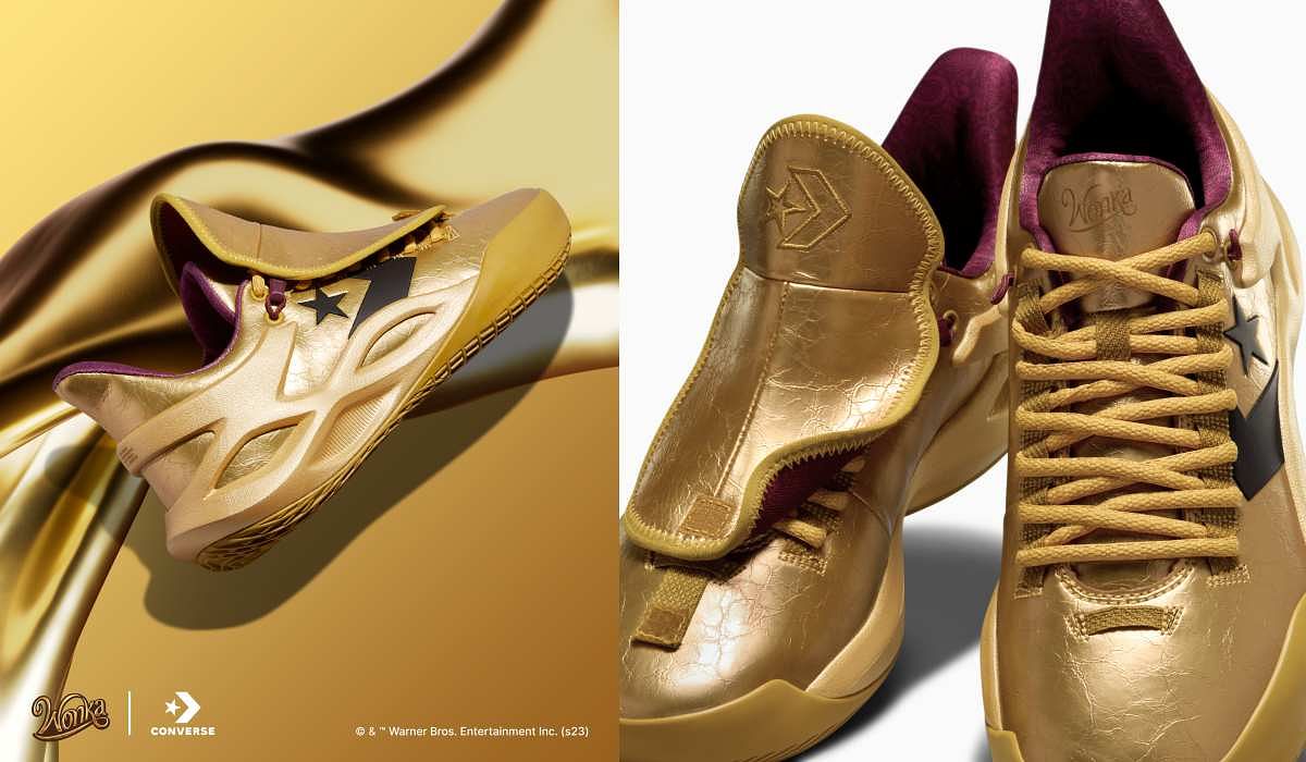 本次聯名系列給多款經典鞋型帶來一系列奇妙的轉變。其中包括兩種配色的CHUCK 70鞋款:皮革款搭配深色“巧克力漩渦”花紋,絨面款則以影片角色“Oompa Loompa”為靈感著以奪目亮色鞋面 ; 和以威利·旺卡絲絨外套為靈感的“Corduroy”CHUCK TAYLOR ALL STAR ; 此外,ALL STAR BB TRILLIANT CX籃球鞋聯名款以金色拼接設計為主,通體的金色鞋面彷彿隨時準備在球場上綻放異彩。