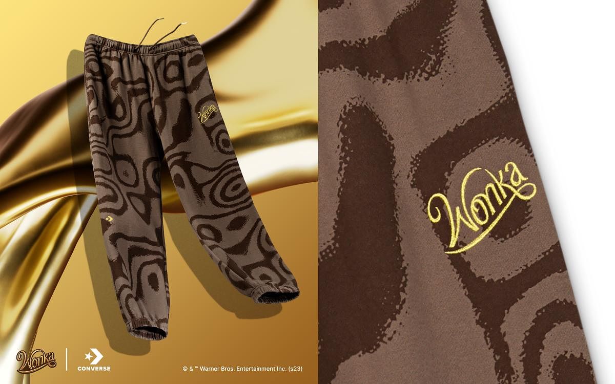服飾系列包括T恤、配套慢跑褲和圓領衛衣,金屬風金色印花和CONVERSE x Wonka聯名細節設計,為青少年款服裝賦予別出心裁的奇幻意趣。
