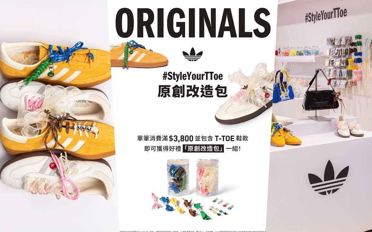 隨著復古美學風格的流行回潮,adidas Originals以T-TOE家族復古魅力,結合時下話題Remake改鞋風潮,特別推出包含豐富的各式配件,包含多彩吸睛的多款鞋帶及吊飾,串上多種風格的個性配件,邀請街頭男女的發揮創意,為T-TOE鞋款注入全新個人特色。同時,adidas Originals獨家推出三葉草鞋扣、三葉草掛飾及印滿三葉草monogram的多彩鞋帶,繽紛多彩的原色力量結合三葉草激發出無限創意風格。7月19日 (五)起,adidas Originals於全台指定店點及官網推出「#StyleYourTTOE原創改造包」滿額贈活動,凡於全台指定Originals店點及官網上購買T-TOE家族鞋款並單筆金額滿NTD3,800,即可獲得「#StyleYourTTOE原創改造包」1組。改造包分為夢幻蕾絲主題包與酷玩掛繩主題包兩款,每改造包內包含三葉草限定配飾在內等從鞋帶、掛件到配飾等豐富配件,無論甜美或酷帥,滿足潮流玩家的創作慾望。
