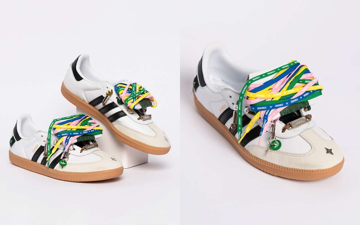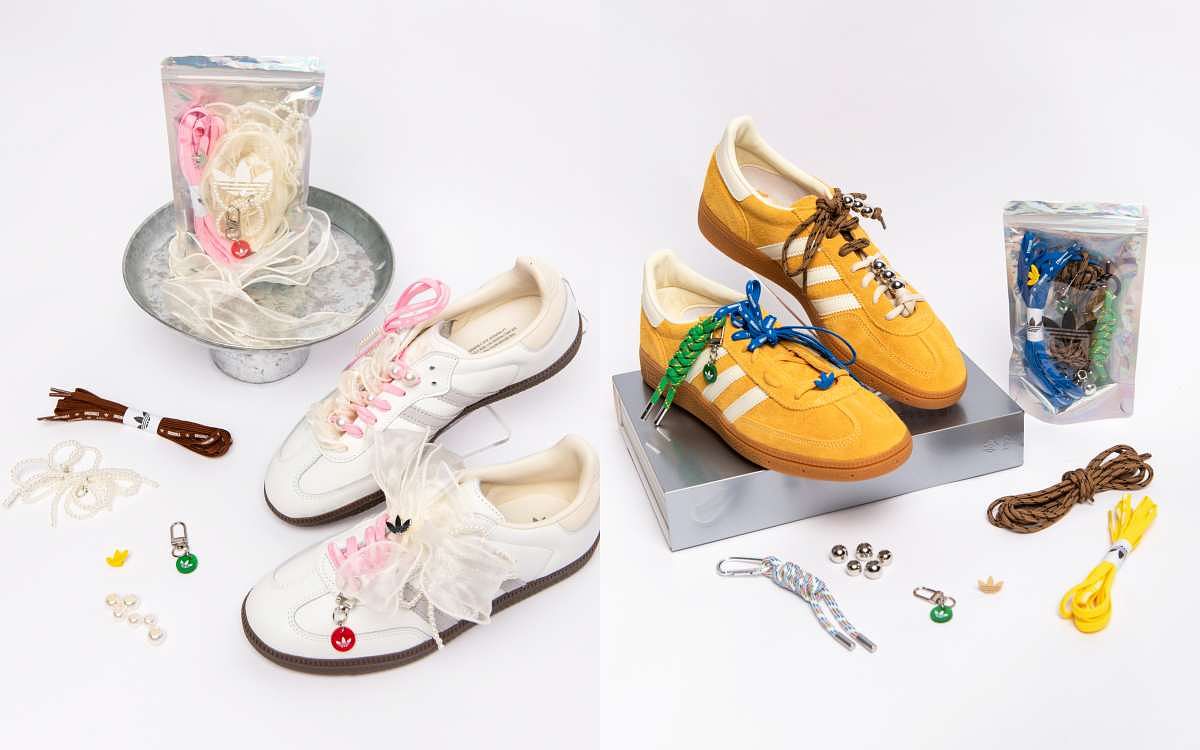 圖片來源:adidas潮流KOL Xin以Samba LT 鞋款,將T-TOE 經典鞋型與翻折鞋舌兩大特點延伸改造,大膽採用多條三葉草彩色鞋帶層層纏繞於鞋舌處,並於多處加入Xin個人品牌 ARC ROOM 識別細節,以抗撕裂標籤加以固定,增強鞋款的份量感,繽紛色系和巧妙融入的珍珠元素,體現Xin獨特的街頭風格。