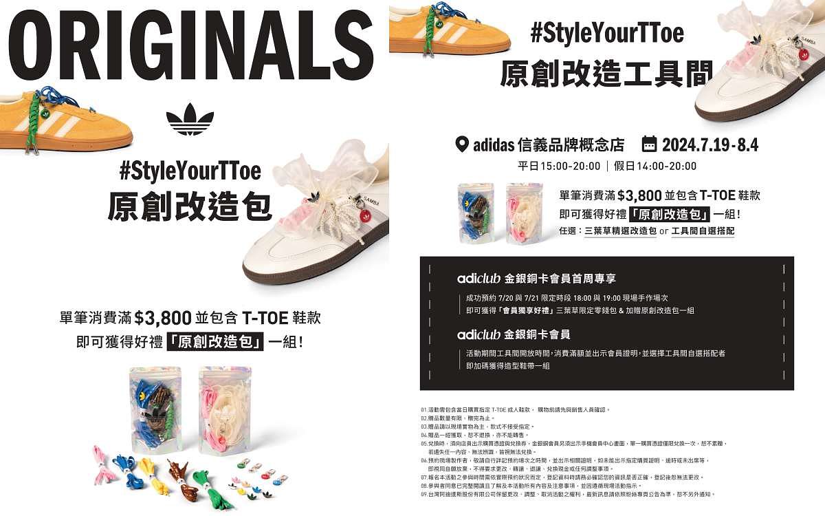 7月19日(五) 起全台adidas Originals指定官方直營門市與官網,單筆消費滿額 $3,800 並包含 T-TOE 鞋款 ,即可獲得好禮「原創改造包」1組。數量有限,送完為止。