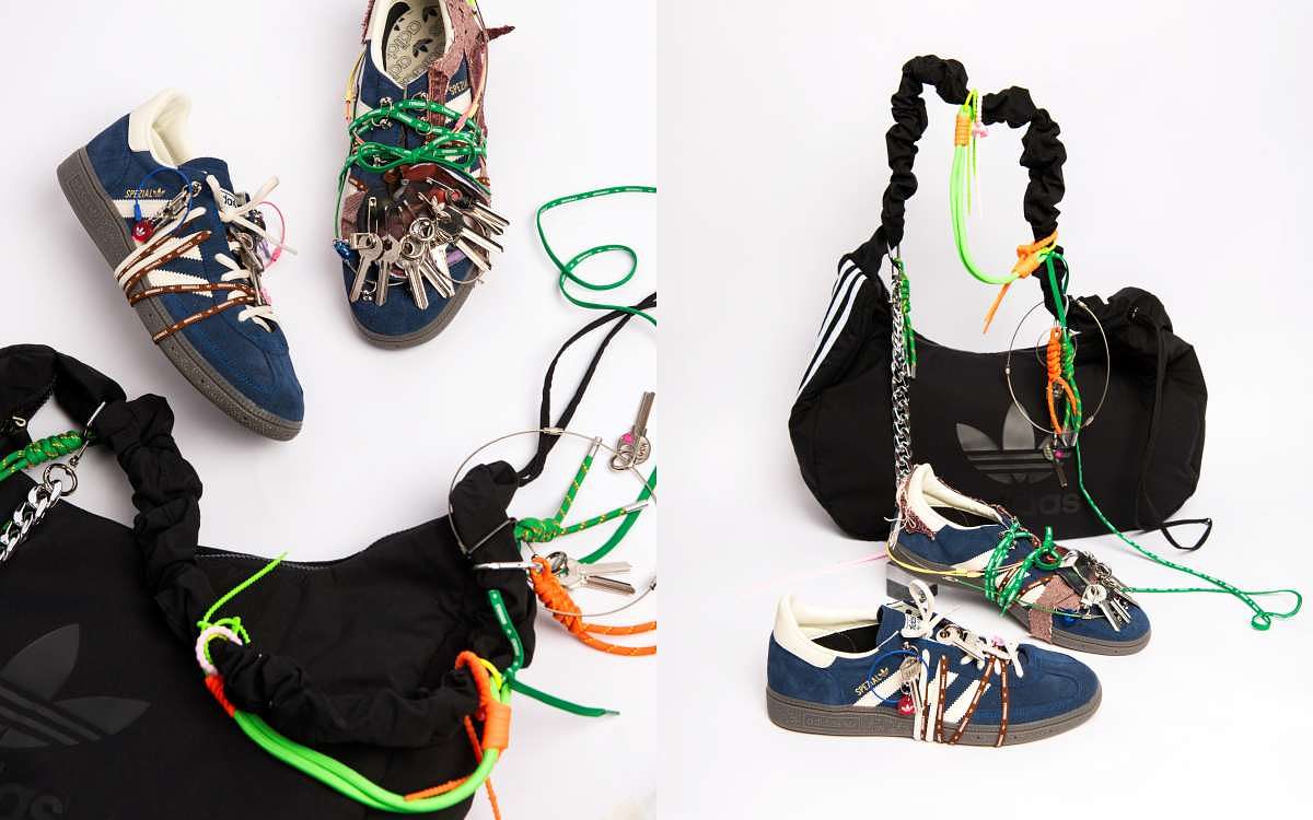 圖片來源:adidas新銳藝術家陳楷恩kaynkenchen 以個人經驗結合街頭文化美學,重塑HANDBALL SPEZIAL鞋款。靈感源自「不小心弄丟家裡鑰匙」這樣細微的生活突發事件,在悠遊街頭時途經施工中建地,破損的牛仔褲、散落地面的細鋼繩等元素,不同顏色的三葉草鞋帶纏繞鞋身,而鞋扣則如同鑰匙環一樣與整體結合一體,詼諧幽默的故事背後,是對HANDBALL SPEZIAL鞋款的無邊想像,帶來前衛風格。