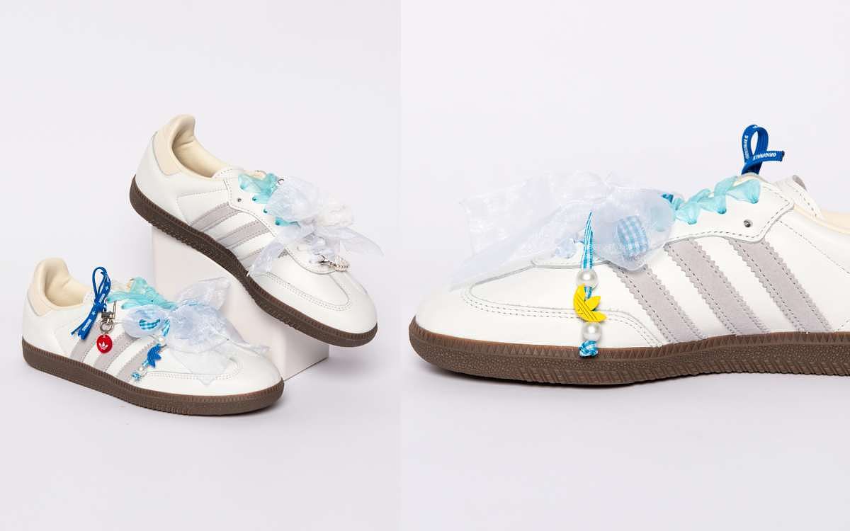 圖片來源:adidas百萬Youtuber 美食水水千千選擇經典Samba OG打造Summer Balletcore風格,充滿夏日氛圍的水藍色與白色緞帶營造清新主色調,鞋身後段分別混搭格紋及蕾絲呈現細節,大蝴蝶結增添可愛層次,巧妙點綴限定的三葉草扣飾與鞋帶打成的蝴蝶結,與隱藏期間搭配的珍珠掛飾形成柔美氣息,一場浪漫的夏日圓舞曲就此展開。