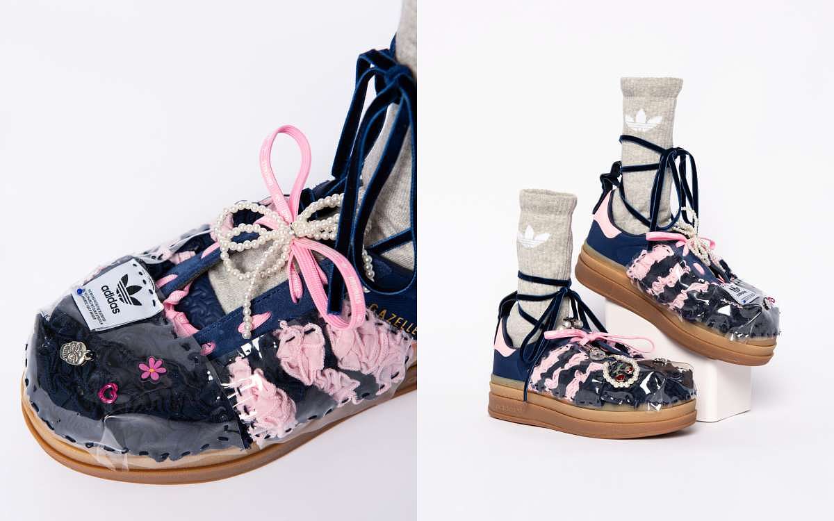 圖片來源:adidas視覺藝術家謝昕妮Sydney Sie以極繁主義與Y2K風格為靈感。將GAZELLE BOLD鞋款化作貼紙簿,並大膽將鞋子改造成瑪莉珍鞋型,三葉草掛飾與粉色三葉草鞋帶對比深藍鞋面呈現童趣配色,結合電子機、玩偶等裝飾物,將Sydney Sie成長過程中,與朋友間的交換和分享呈現在鞋面與包款上,創造出獨特而難忘的視覺體驗。