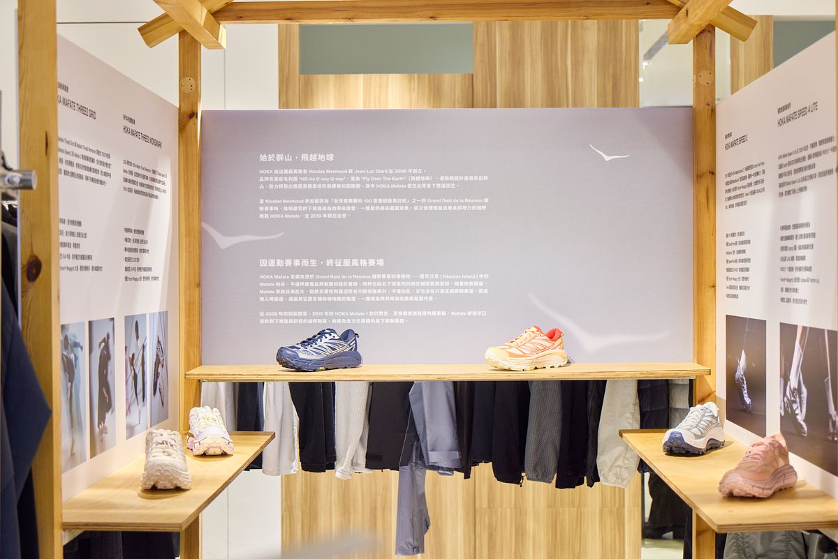 以木質層板構築的展示牆,完整梳理 HOKA Mafate 系列自 2009 年原型問世以來的設計演進。從最初為征服留尼汪島峽谷賽道而生的厚底原型,到現今的Mafate Three2,觀者可一窺品牌如何將越野科技融入都市日常。