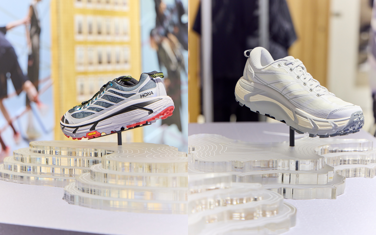 以「Mafate 等高線」為靈感主軸,打造層層堆疊的壓克力地形結構,作為 HOKA × oqLiq 合作主視覺與四款重點鞋款的展示平台,象徵峽谷地貌的起伏與探索精神。現場陳列 Mafate Speed 2、Mafate Three2(Wordmark)、Mafate Three2(Grid)與 Mafate Speed 4 Lite 四款Mafate Lifestyle鞋款。