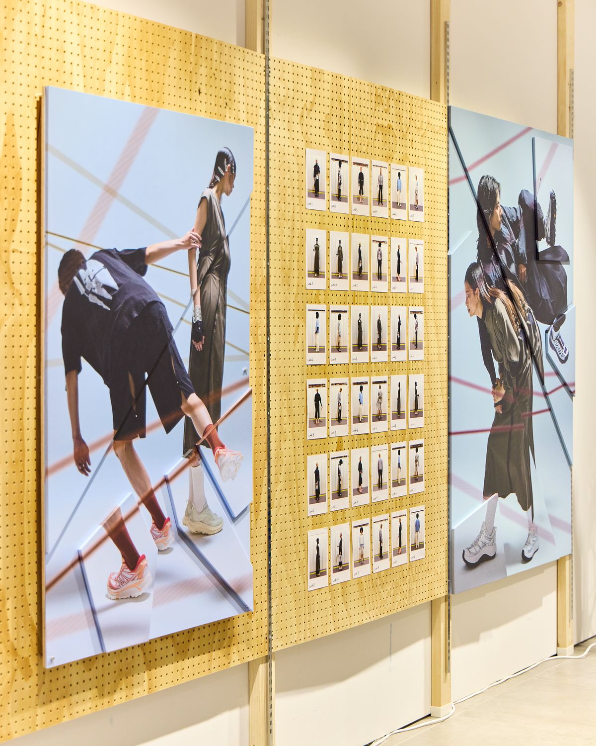 重現臺北時裝週《INTERLACE|交錯場》的服裝造型與現場氛圍。人台展示 oqLiq 同款秀服搭配 HOKA Mafate Lifestyle 鞋履,牆面輸出秀場影像與幕後花絮,電子螢幕循環播放走秀片段,讓觀者重返山林與都會交錯的伸展台節奏。