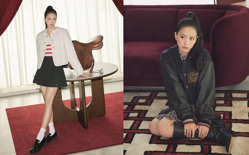 JISOO 以兼具俏皮精神與標誌性優雅的姿態,為系列注入生命力。她身穿黑色皮革外套,搭配斜紋迷你襯衫洋裝與及膝長靴,展現自信風采;同時亦演繹更為精緻的新年造型,包括象牙白絎縫外套搭配金色鈕扣,內搭紅白條紋針織 Polo 衫,下身為黑色百褶迷你裙並搭配經典樂福鞋,完美呈現她對現代學院風格的自信詮釋。