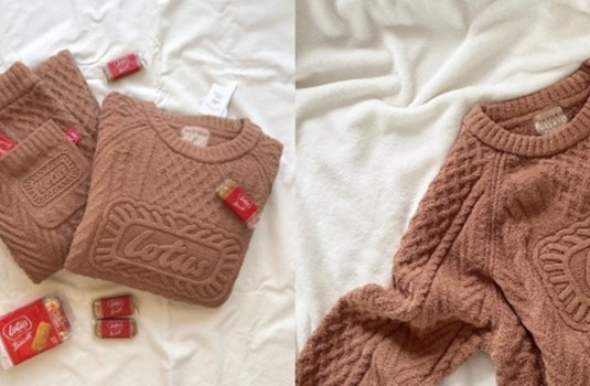 以蓮花薄脆餅標誌性的「肉桂餅乾色」帶來針織套裝、針織外套,室內拖鞋與襪子、毯子等等,配上麻花織紋就真的好像餅乾一樣,彷彿都能聞到焦糖肉桂與烘焙的香氣!