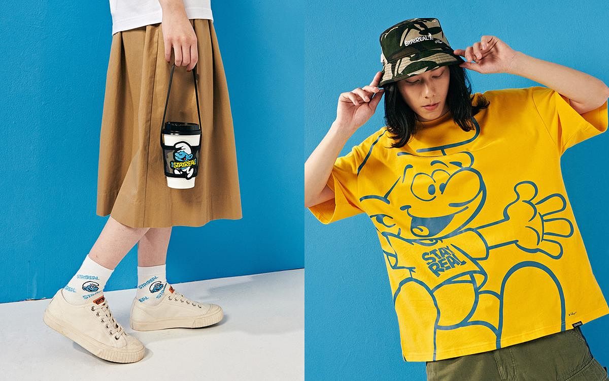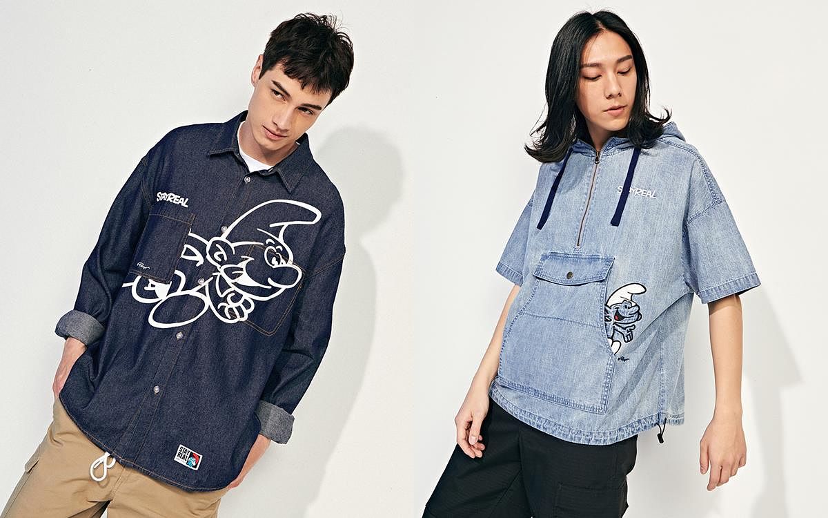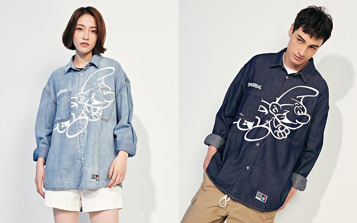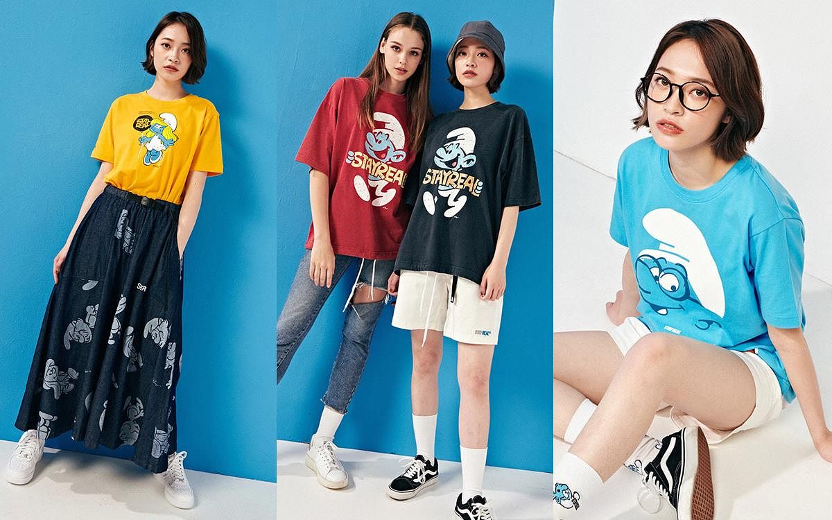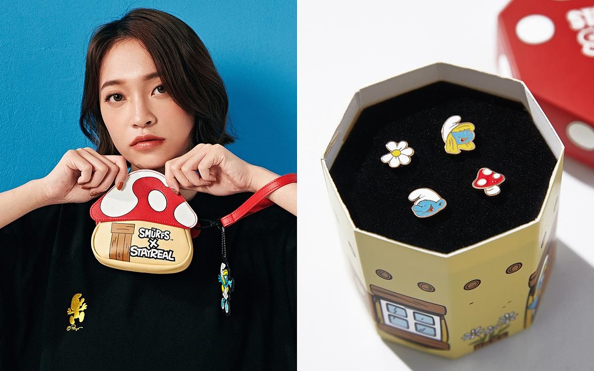 生活在大森林,頭戴白色小帽子住在蘑菇屋的藍色小精靈,每一位都有自己的獨特個性,他們分工合作運用智慧對付邪惡的巫師,精彩又充滿趣味的故事總讓人看了會心一笑!這回STAYREAL發揮擅長的翻玩創意,結合藍色小精靈中的人物特色以及魔法氛圍,生動刻畫他們的每個動作與表情,同時也加入多款潮流注目的剪裁版型,包括潮流拼接剪裁T、丹寧襯衫、圖騰長裙、短袖拉鍊夾克以及復古仿舊寬版T…等。除服飾外,就連聯名配件都相當吸睛,有以藍色小精靈居住的蘑菇屋為造型藍圖的手拿包與耳環組,還有小精靈迷彩印花、潮流腰包以及繽紛襪子組,款款都像被塗上繽紛的顏色一樣,將歡樂俏皮的氛圍發揮到極致!