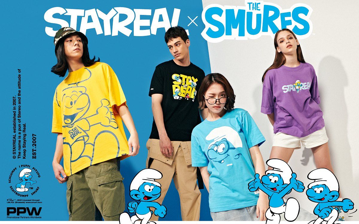 來自比利時的經典動畫卡通「THE SMURFS藍色小精靈」,以生動活潑的趣味故事風靡全球,其獨特鮮明的人物形象活躍在各大領域,包括電視、電影、主題公園、潮流服飾、遊戲等,廣受國際品牌的高度青睞。2021年夏季STAYREAL 首度與藍色小精靈推出聯名系列,以「潮流冒險王」為主題,集結多位主角人物齊登場,展現藍色小精靈集機智與勇敢於一身的獨特性,傳遞森林世界的冒險精神與快樂生活。