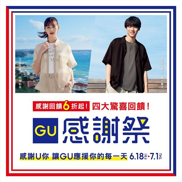 ▲GU於6月18日至7月1日推出「GU感謝祭」,精選百款男、女、童裝夏季商品,推出期間限定價及合購優惠,再祭出「四大獨家驚喜回饋」。