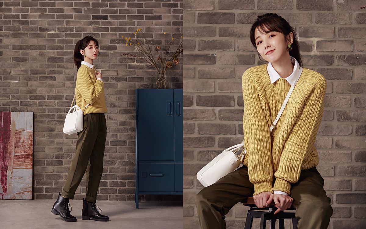 ▲GU「品牌好友」邵雨薇選擇亮眼的芥末黃色「高領粗紡針織衫」,恰到好處的高領設計可內搭襯衫展現層次感,再搭配橄欖綠的「Chef pants主廚褲」,打造專屬秋冬的質感大地色穿搭。
