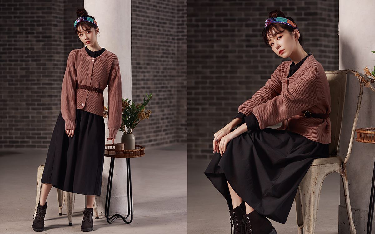 ▲GU「品牌好友」邵雨薇特別以「好感針織外套(乾燥玫瑰粉)」重現新戲復古造型,選擇「女裝立領抓皺連身裙」並加上腰帶收緊腰部線條,同時運用撞色髮帶展現溫婉打扮。