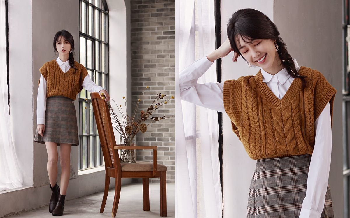 ▲GU「品牌好友」邵雨薇本次以褐色的「短版粗紡針織背心」搭配經典長袖白襯衫以及格紋迷你裙,展現氣質甜美的零失誤好感穿搭。