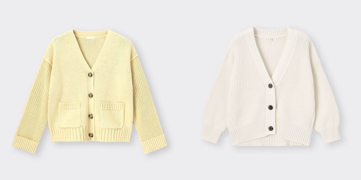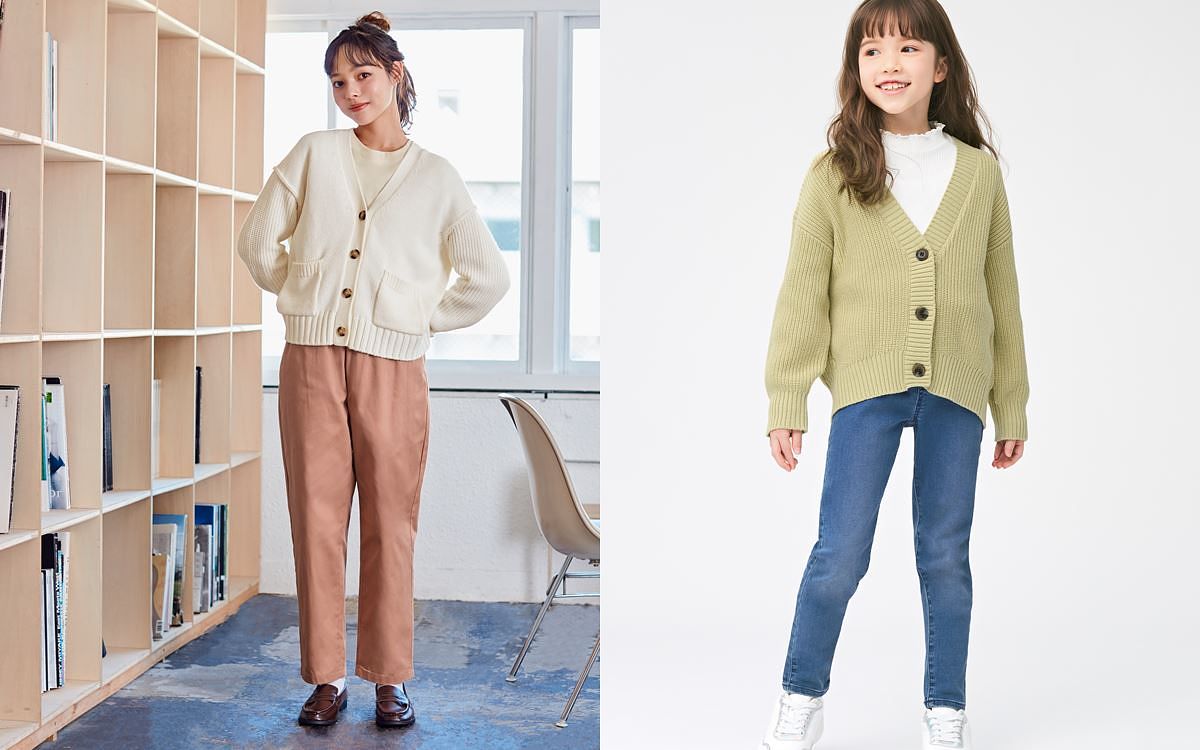 ▲GU為不同年齡層的女生們精選舒適又百搭的針織外套單品「女裝棉質混紡雙口袋開襟外套」(圖左)及「女童麻花繭形開襟外套」(圖右),輕鬆打造新年的日系親子穿搭!