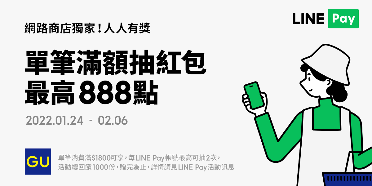 凡於指定日期(1/24-2/6)在GU網路商店使用LINE Pay付款且單筆消費滿$1,800元,即可隨機獲得最高888點LINE Points的限量紅包! # 限量1,000組,送完為止,每LINE Pay帳號最高可抽2次。# 本活動恕不適用於實體店舖,詳細活動辦法請參考活動網頁說明。