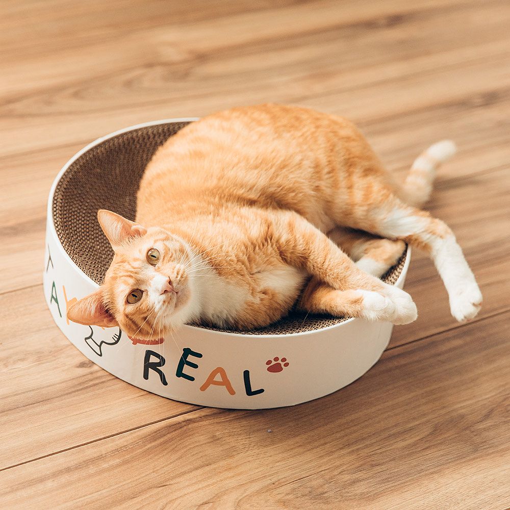 使用高密度且厚實的瓦楞紙製成,紮實又耐用,大面積的圓餅型設計,外圈印上可愛的呆萌貓貓圖案,無論是磨爪、休息與玩耍,絕對都讓喵星人倍感享受!