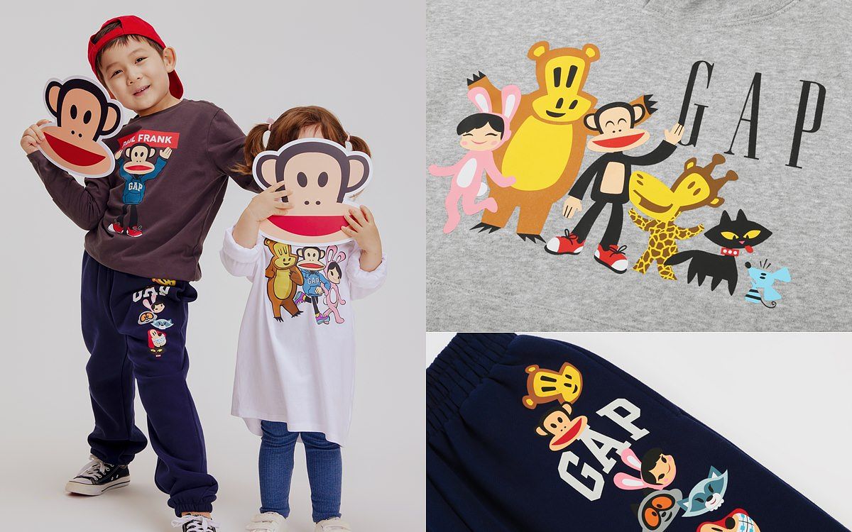 Gap除了透過模特演繹個人特色外,更聯手知名品牌、卡通推出經典Logo系列單品鼓勵消費者勇於表達自我。首度邀請美國知名的漫畫家、插畫家兼流行商品設計師Paul Frank所設計的大嘴猴Julius與其他可愛夥伴們來到Gap聯名世界。透過繽紛活力的配色,以及熱衷探索新事物的大嘴猴,為經典產品注入潮流新意。Paul Frank大嘴猴聯名系列推出多種品項,包含長袖T、帽T、大學T、外套、棉褲等,尺寸從成人到兒童款式皆具備,目前已於Gap全台門市及官網開賣,邀請全家人藉由潮流面貌迎接活力滿滿的生活態度。