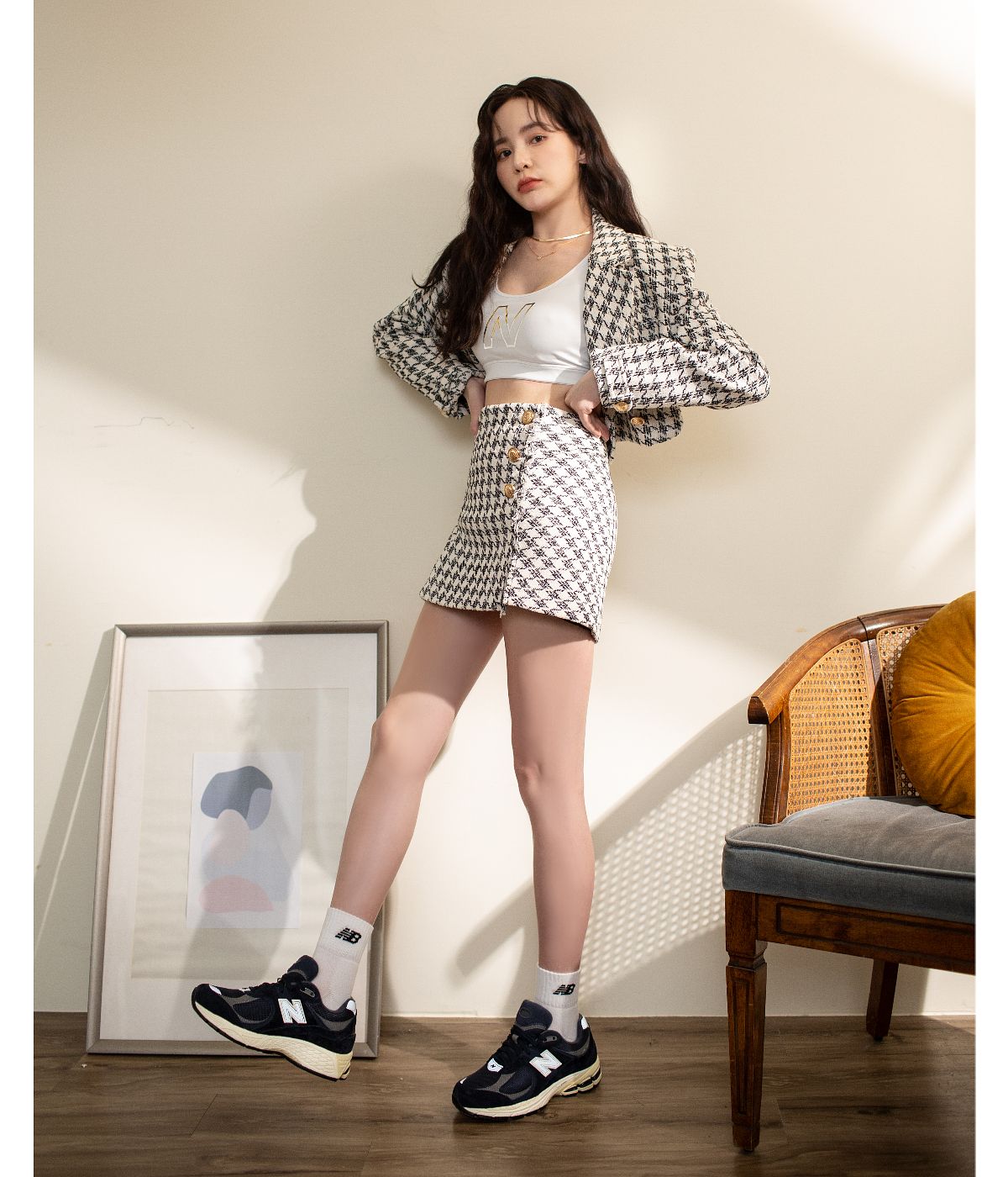 想要穿出Y2K一點也不難!從最簡單的第一個Tips著手,用「One tone調的suit」就能輕鬆營造韓系Y2K風格中的時髦高級感~Doris選擇帶有復古氛圍、不退流行的千鳥格紋套裝,合身短版的西裝外套搭上同款式西裝毛呢短裙,更襯托出精緻感受,內搭上衣則選擇New Balance白色系bra top來提振搭配中的輕盈感受,用正裝與休閒單品混搭出專屬Y2K的俏麗時髦樣貌,讓經典正裝也顯得層次新穎而豐沛!