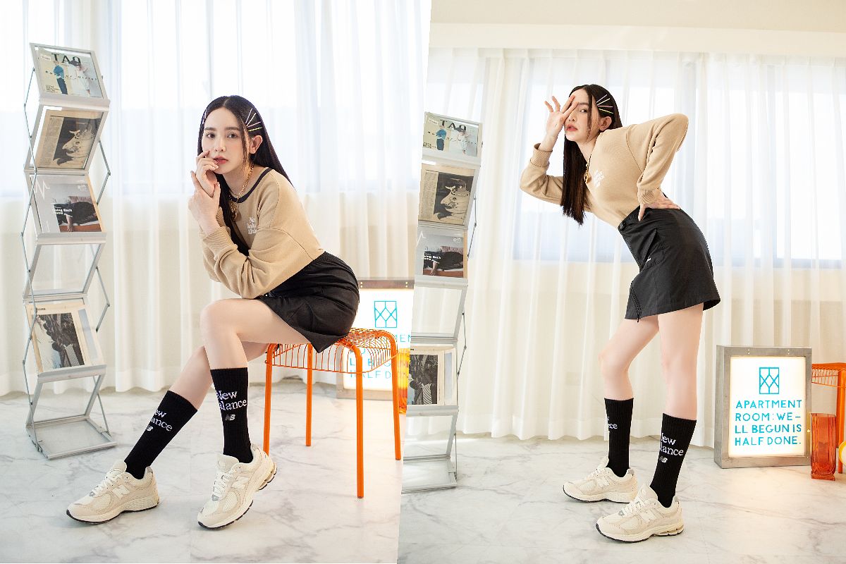 入秋天氣轉涼,但還是想展現露肌感!以New Balance經典logo休閒棉質大學T搭配NB經典logo拉鍊工裝短裙,記得一個最重要的小訣竅!就是「上衣紮入下身」不論在視覺或比例上,一秒呈現腿長無極限的逆天長腿效果!同時秉持著身上不超過三個主色的原則,著用NB字樣經典黑長襪,鞋款選擇和上衣相似色選的奶油白色「M2002RCC」,讓Y2K風格注入運動風率性細節,微辣之餘也不忘展現高段穿搭質感。