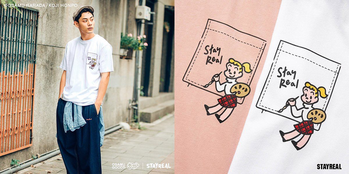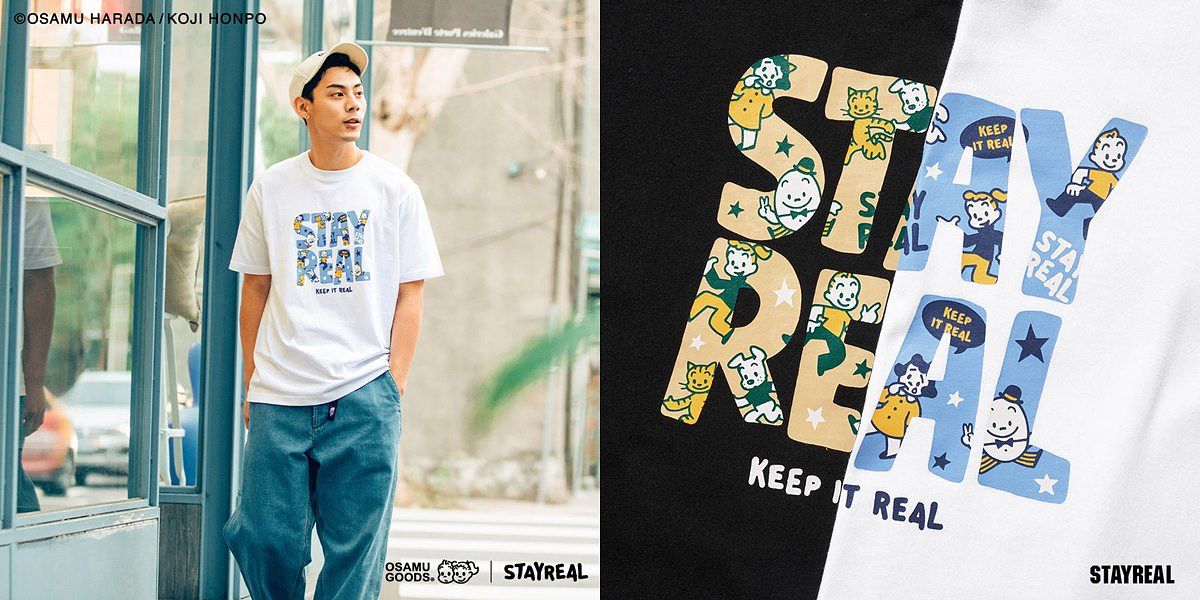 STAYREAL推出的美式復古系列,以手繪風格精彩呈現友情的氛圍,讓每一件T-shrt都能感受最療癒的純真初心時刻!這次還加入許多創意巧思,將可愛的圖案與STAYREAL的LOGO創意結合融入在星空畫布中,帶大家進入「OSAMU GOODS」的人物世界,展現可愛又繽紛的快樂畫面!