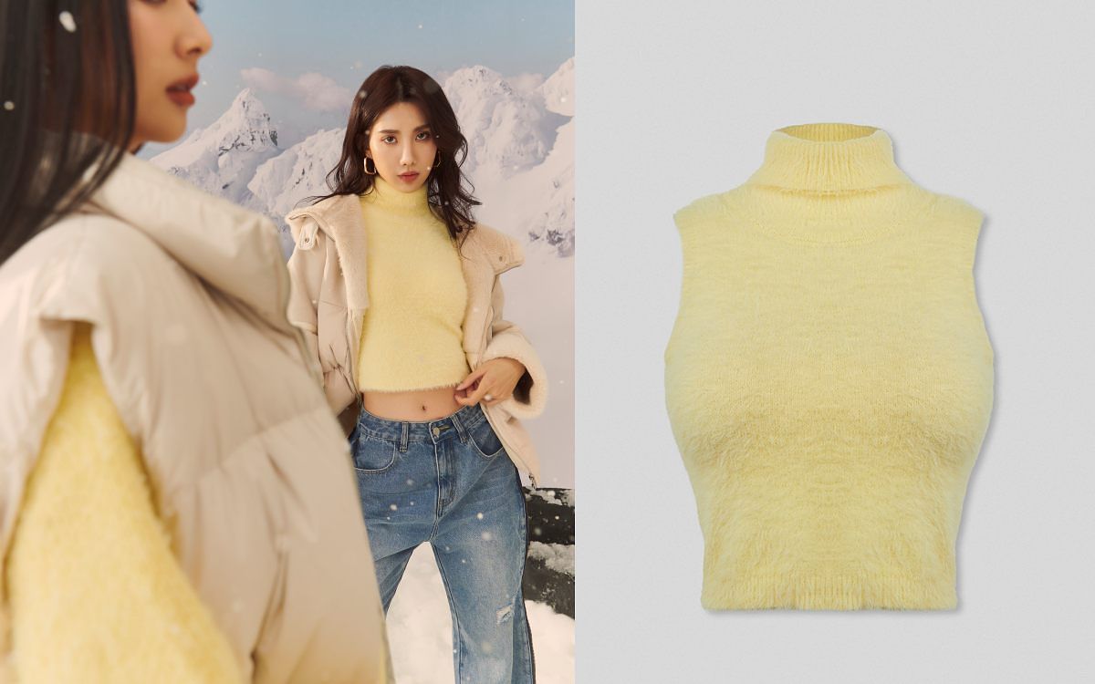 偏好自由搭配上下身的女孩,推薦「仿貂絨高領bra背心」,採用仿貂絨長毛紗線,高領修身背心款式搭配外套不顯臃腫,針對亞洲人膚色精心調合、修飾蠟黃膚色的俏皮黃與高冷灰,穿上立馬成為派對焦點!