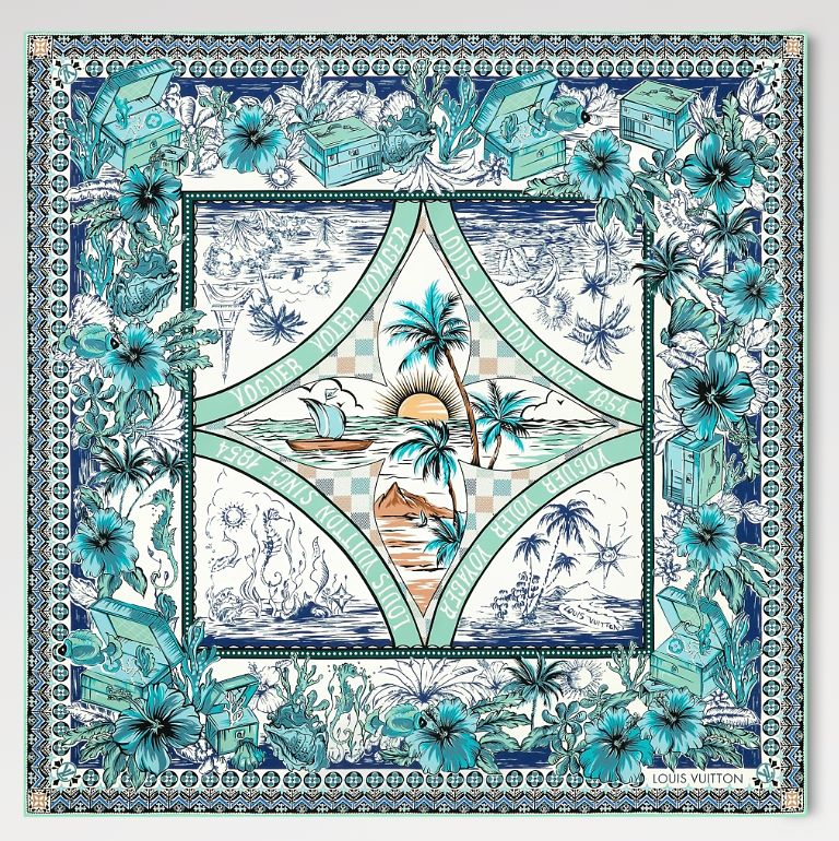 Louis Vuitton LV Island 90藍綠色方巾,NT18,900。