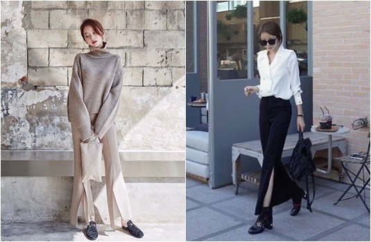 許多比例不夠好、腿部線條不夠滿意的女孩們,經常不敢亂搭平底鞋,總是要有一點高度才安心,尤其近年來流行的窄管褲與寬褲對於這樣身型的女孩來說,更需要跟鞋的幫助才能達到修飾身材比例的效果,所以了~女孩們更是要選擇開衩褲!因為穿上它平底鞋也能顯高,開衩的部分露出纖細的腳踝處,擺動的褲襬能修飾腿部線條,讓缺點被隱藏,不像短褲、裙暴露整雙腿,也不像窄管褲讓曲線原形畢露,類似喇叭褲的褲型也更改善了寬褲穿不好易顯胖的問題。