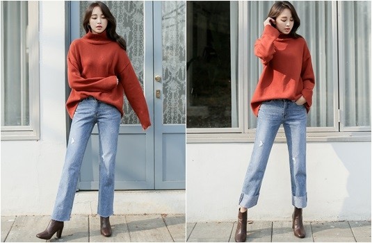 過去女孩們絕對會把丹寧褲反摺個幾摺起來,無論是過長、想露出腳踝、變化穿法等,都讓摺起的褲管變成一條細長又厚的形狀卡在腳踝處,這樣的穿法非常適合纖瘦長腿的女孩,但卻會讓更多女孩暴露腿部線條缺點,現在其實妳只需要反摺「一摺」,並將反摺處「放大變寬」,那麼長腿瞬間就找上妳!更輕鬆穿出韓妞時髦感喔~