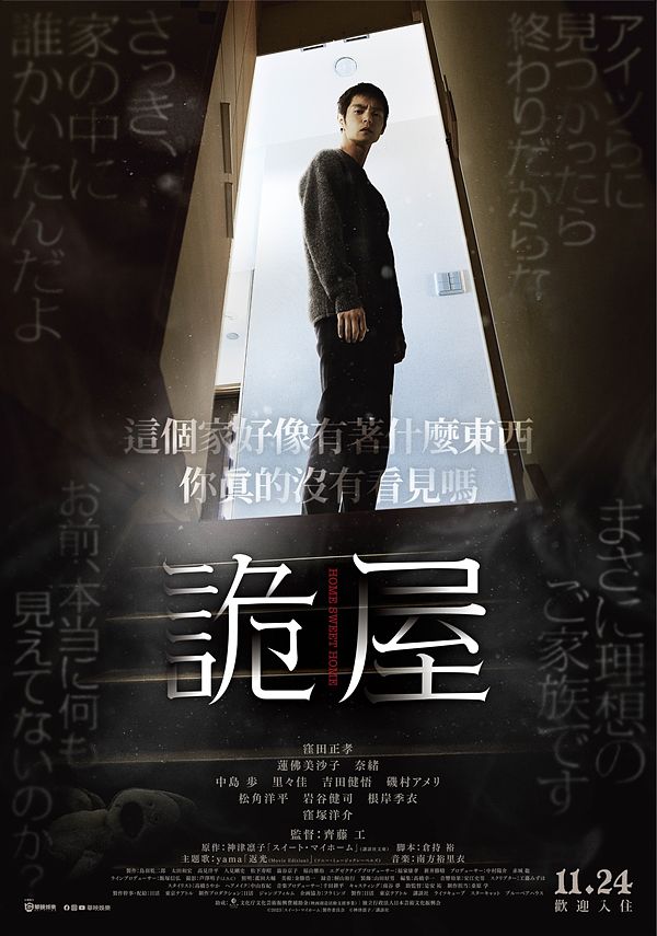 日本恐怖電影《詭屋》改編自知名戰慄恐懼小說,由演員轉型導演的齊藤工執導,並集日本實力派演員漥田正孝、蓮佛美沙子、奈緒及漥塚洋介合作演出,電影將於11月24日上映。齊藤工首度挑戰恐怖懸疑題材,故事聚焦在主角漥田正孝為了家人買了一棟溫暖的新房子,搬入新居後卻發生一連串恐怖事件,並不斷向外擴散,原應該是溫暖甜蜜的家,卻變成充滿不安恐怖的屋子,故事充滿了被窺視的恐怖感受。