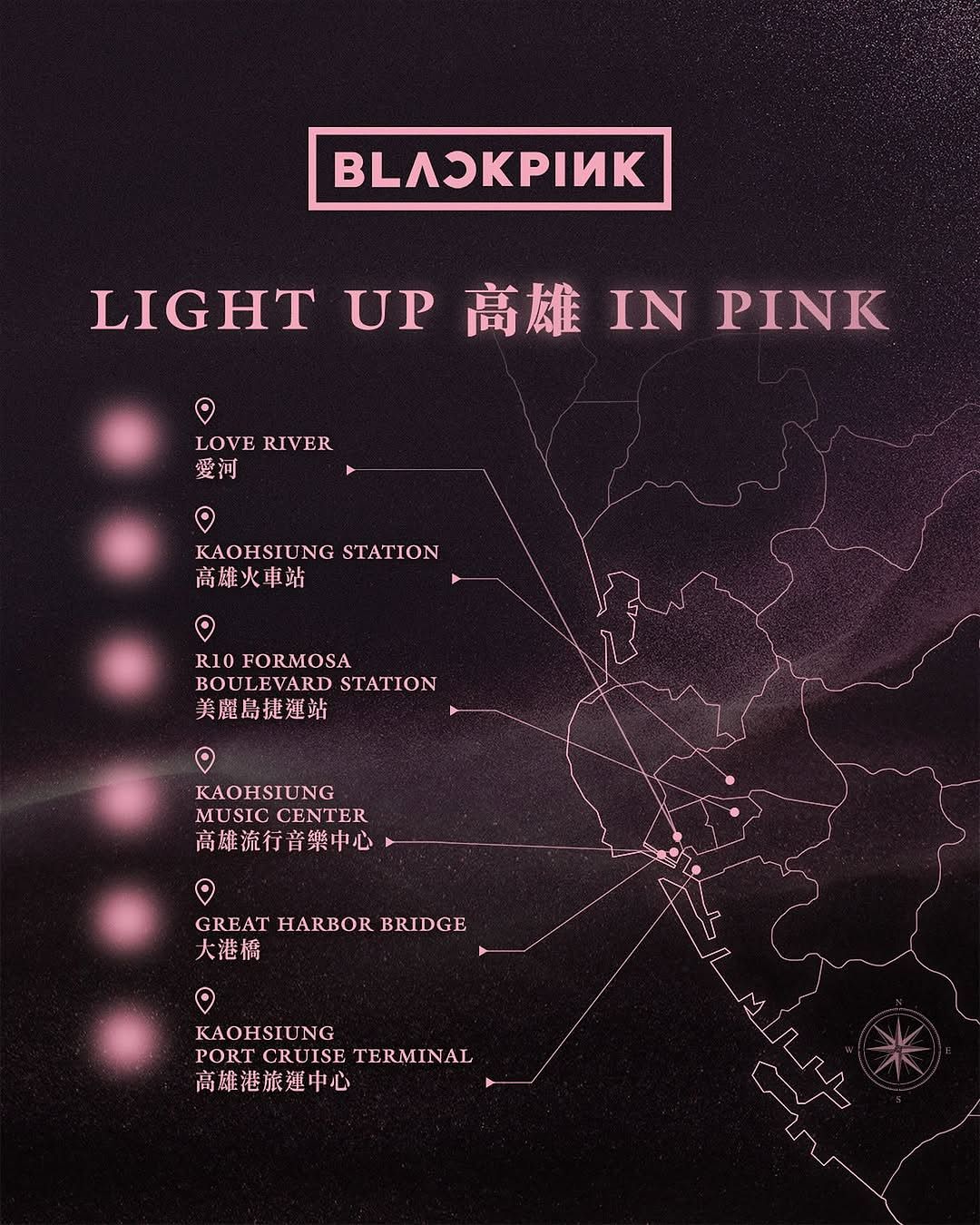 而更驚喜的是,昨晚(12 日)BLACKPINK 演唱會主辦單位理想國於社群宣布,自 13 日起將在高雄六大代表地標包括愛河、大港橋、高雄港旅運中心、高雄流行音樂中心、高雄火車站和美麗島捷運站,舉辦「LIGHT UP 高雄 IN PINK」點燈應援活動,屆時這些地標將亮起象徵 BLACKPINK 的粉紅色燈光,將高雄沉浸在滿滿的「粉墨氛圍」中,讓粉絲們來到高雄不僅能聽演唱會,還能到這些點打卡,展現對 BLACKPINK 的愛!