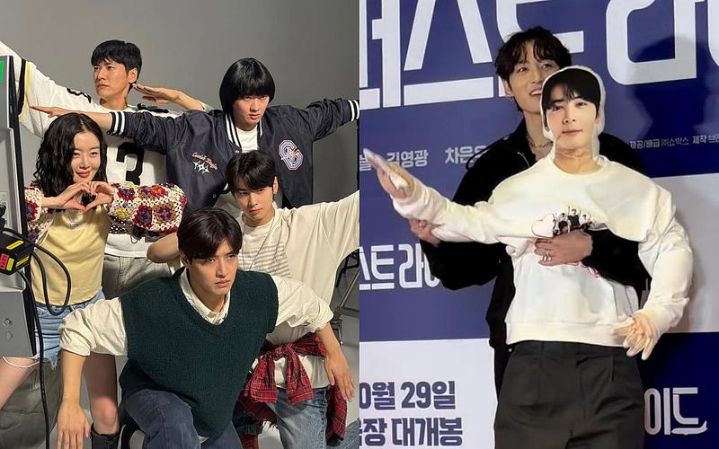 值得一提的是,《放飛旅行團》昨晚(10/27)也在首爾舉辦 VIP 首映會,除了導演率領演員群盛裝出席之外,現場也集結音樂圈、影劇圈巨星共襄盛舉,包括 BLACKPINK 成員 JISOO、歌手 NS允智、饒舌歌手 The Quiett、男團 YOUNITE 成員恩湖與施穩、女團 OH MY GIRL 成員 YooA、女團 Billlie 成員文秀雅等人。演員部分也吸引崔丹尼爾、李茂生、徐現宇(網路又譯徐賢宇)、李聖經等人現身。尤其車銀優因為入伍服役無法出席活動,但同團 ASTRO 成員 MJ,以及 BTS 的 Jung Kook 都特地現身首映會替他應援;Jung Kook 更當場抱起車銀優的「等身抱枕」合影留念,畫面相當萌趣。