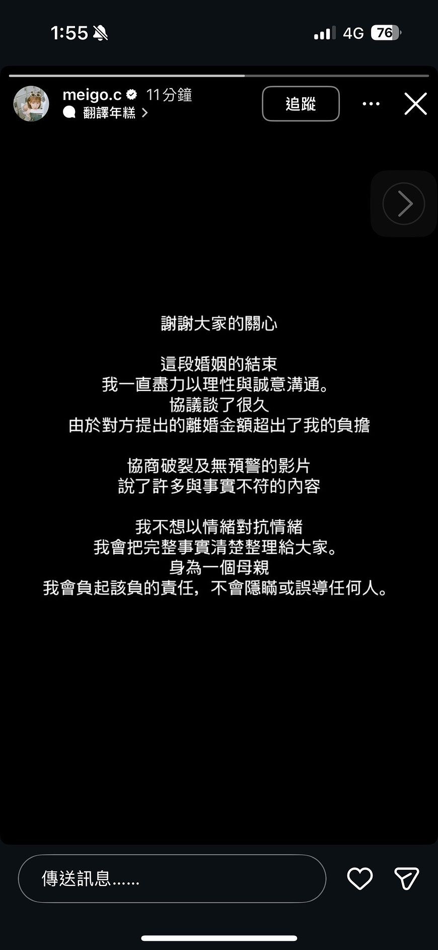 根據粿粿的限時動態表示:「後續將會把完整的事實釐清並且整理給大家。身為一個母親 我會負起該負的責任,不會隱瞞或誤導任何人。」