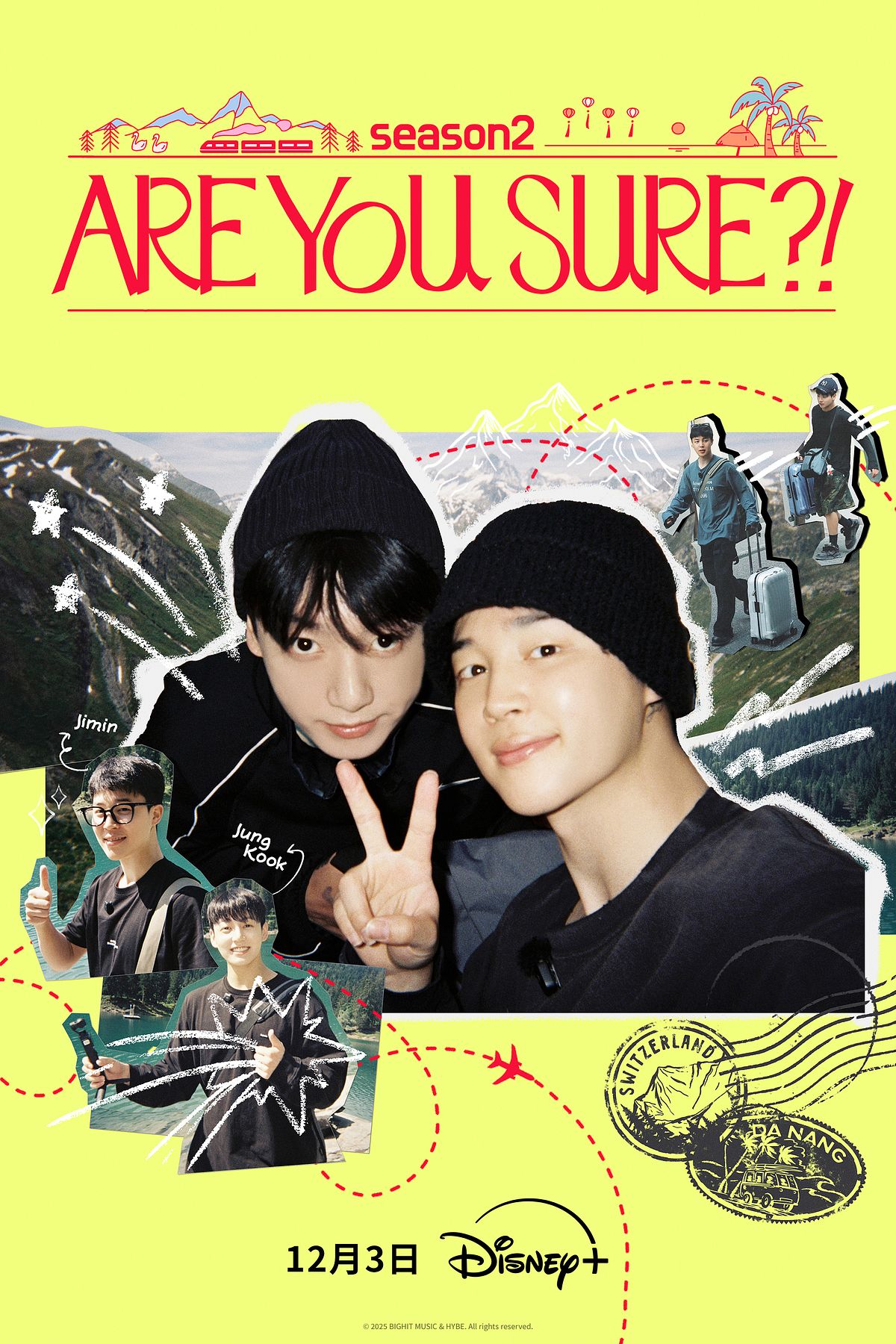 超人氣偶像團體 BTS 防彈少年團大受好評的旅遊實境秀《ARE YOU SURE?!》第二季熱鬧回歸,再度找來「忙內LINE」的 Jimin、Jung Kook 在當兵退伍後踏上瘋狂旅程,讓粉絲一探兩大偶像私底下可愛、調皮的面貌。首波預告在 BTS 防彈少年團官方 YouTube 頻道上架 10 天即突破 122 萬次點閱,第一集開場更讓 Jung Kook 與工作人員直接突襲 Jimin 的住家,讓上半身赤裸的 Jimin 睡眼惺忪苦笑「真的要這樣拍嗎?我先穿衣服吧」。