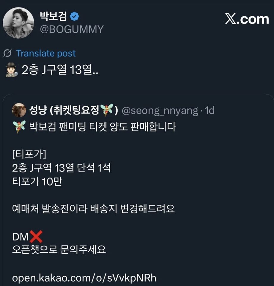 朴寶劍在今年 7 月起開始舉辦行全球巡迴粉絲見面會,而他在 X 上看見粉絲提到黃牛票被炒價變得很貴,寶劍便親自用 X 官方帳號轉發黃牛「加價轉售」門票的貼文,更在文案打出黃牛票的座位,像是:「2樓 J區 13列」、「R席樓層 4區 1列」等。也曾轉發過有人要賣雅加達場的明信片與小卡,寶劍也轉發說道:「啊哥那個不能賣,你真的想賣掉那個嗎?」嚇得那人趕快把文章刪除,親自對抗黃牛的寶劍太帥了!